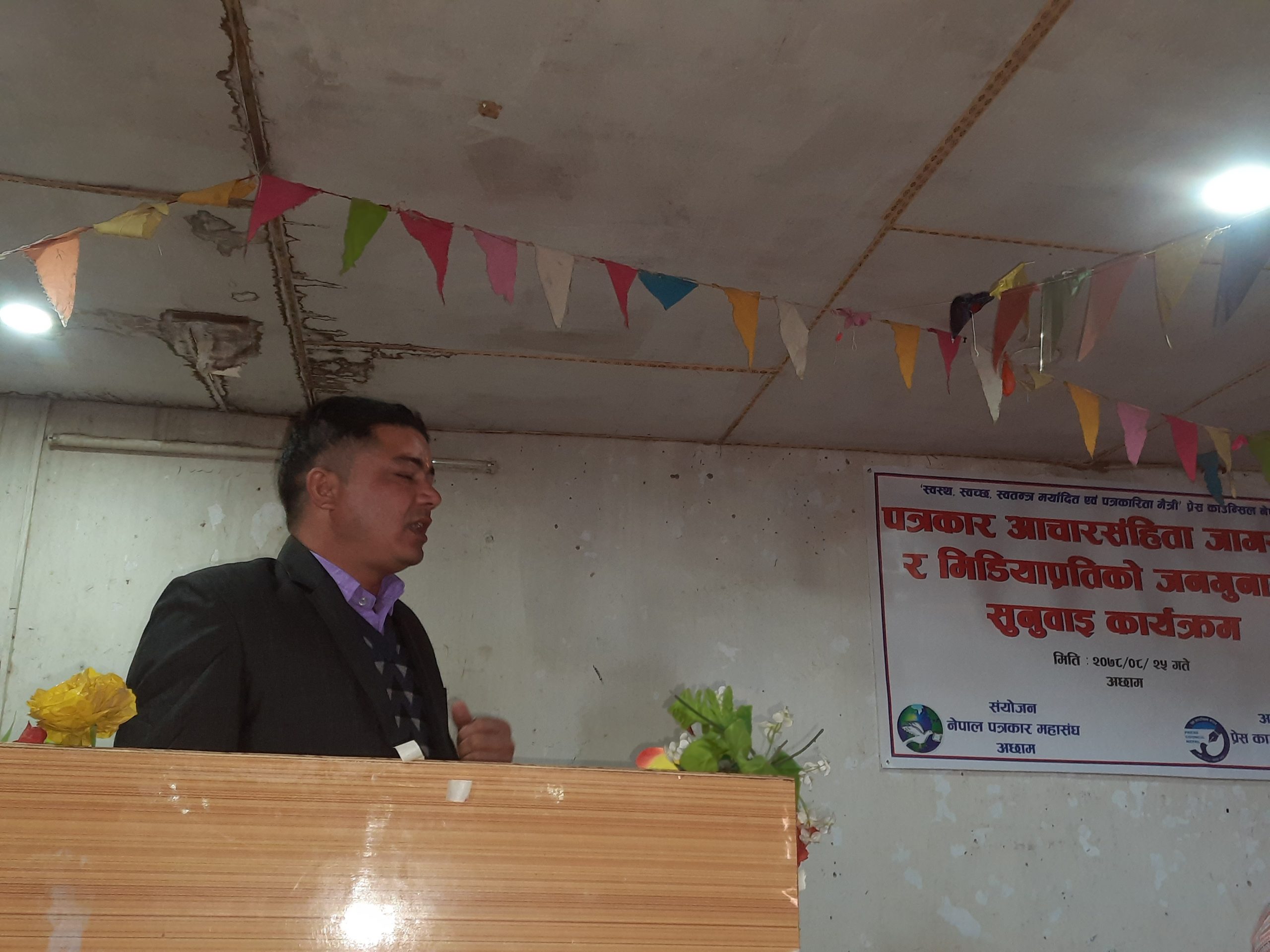 शनिबार जिल्ला सदरमुकाम मंगलसेनमा पत्रकार आचारसंहिता जागरण र मिडियाप्रतिको जनगुनासो सुनुवाइ कार्यक्रमा बोल्दै उनलेे पछिल्लो समयमा पत्रकारको बृद्धि बिकाशमा काउन्सिलले कम चासो देखाएको बताए ।