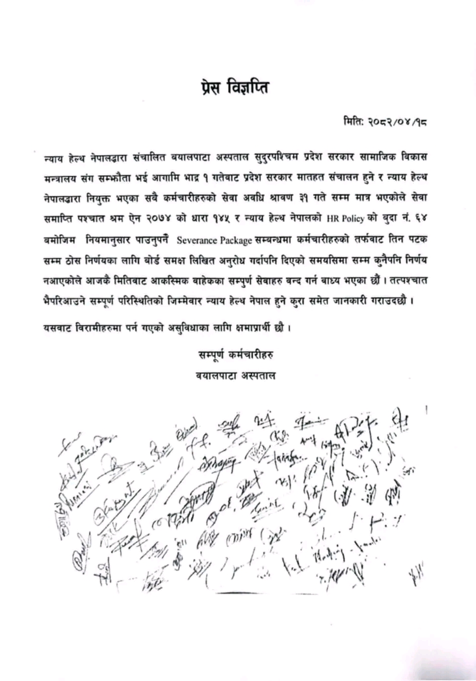 न्याय हेल्थ नेपालद्वारा नियुक्त भएका सबै कर्मचारीहरुको सेवा अवधि श्रावण ३१ गते सम्म मात्र भएकोले सेवा समाप्ति पश्चात श्रम ऐन २०७४ को धारा १४५ र न्याय हेल्थ नेपालको HR Policy को बुदा नं. ६४ बमोजिम नियमानुसार पाउनुपर्ने Severance Package सम्बन्धमा कर्मचारीहरुको तर्फबाट तिन पटक सम्म ठोस निर्णयका लागि बोर्ड समक्ष लिखित अनुरोध गर्दापनि कुनै सुनुवाइ नभएकोले सेवा प्रवाह रोक्नु परेको बिज्ञप्ति मार्फत उल्लेख गरेका छन।