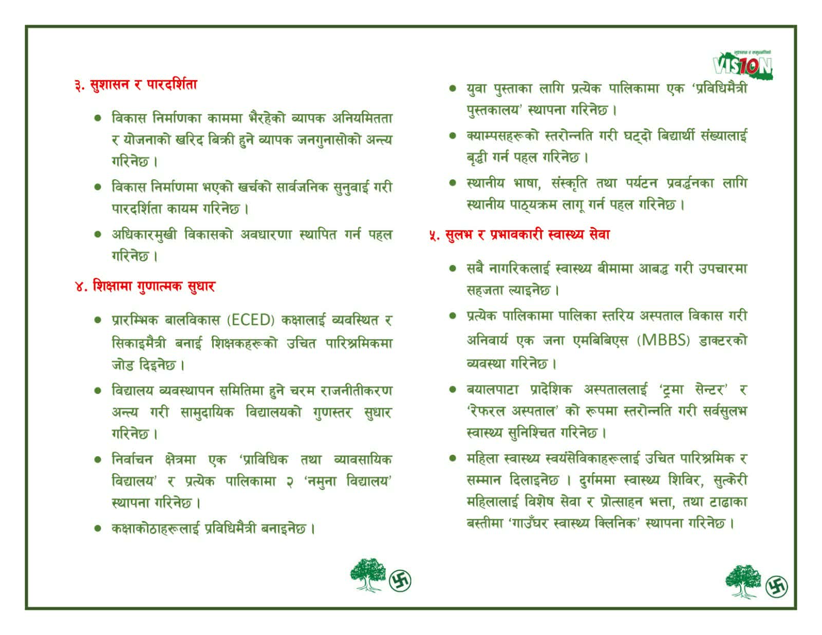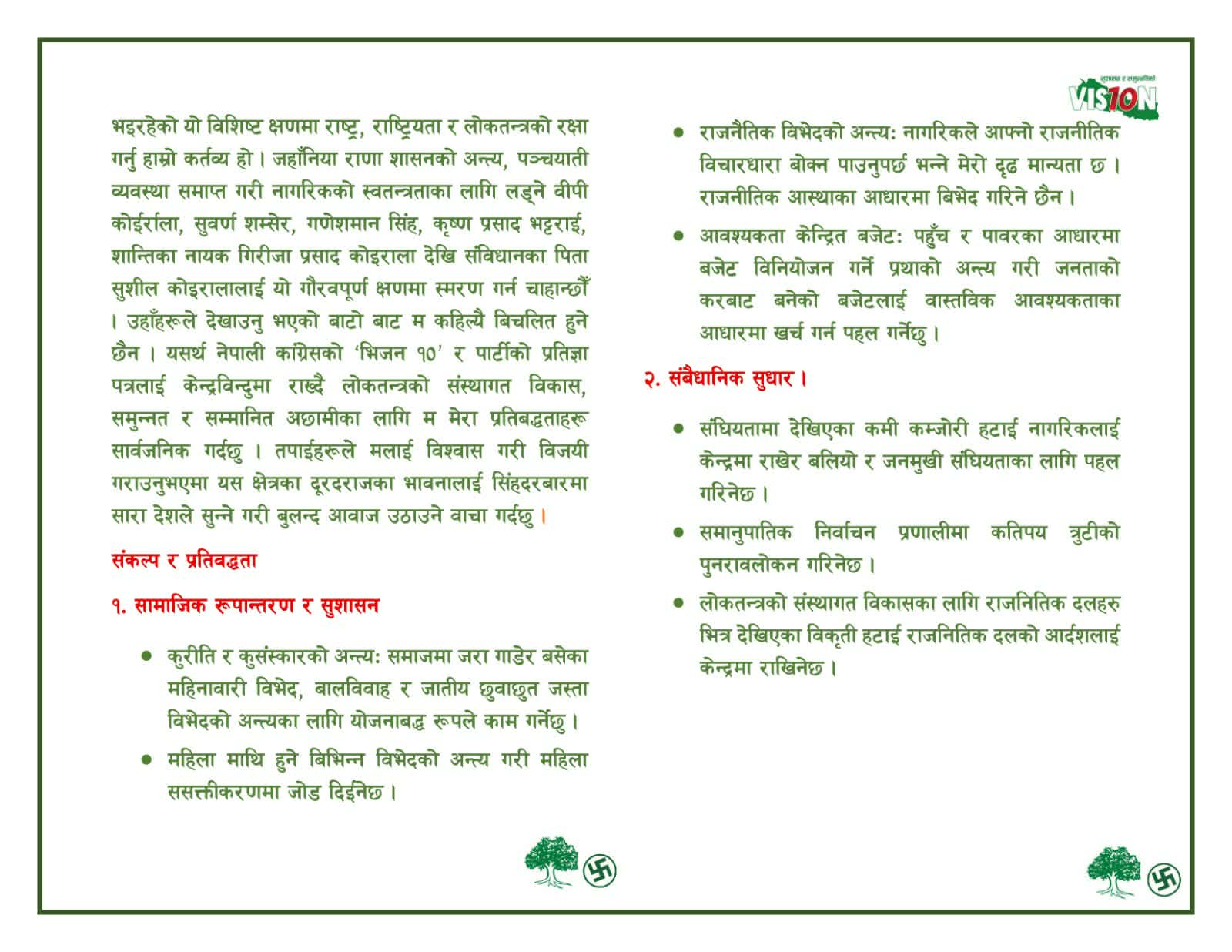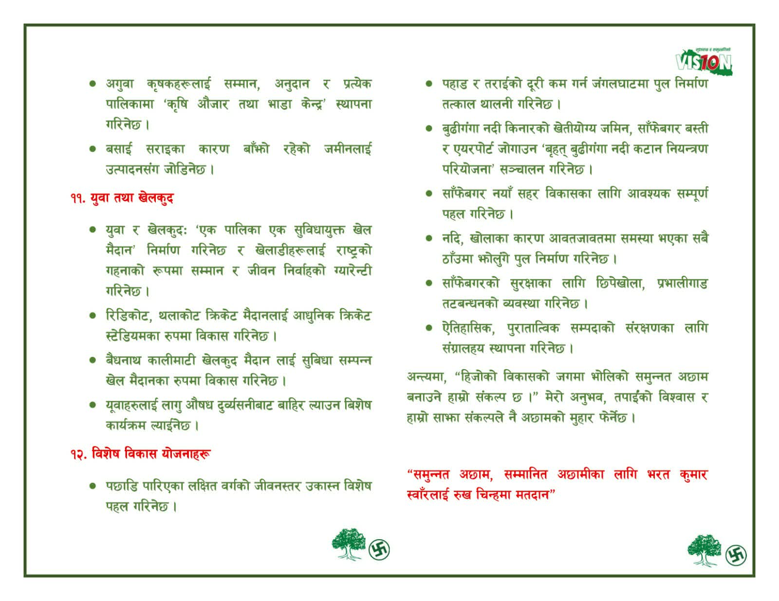 स्वाँरको बाचा पत्रमा सामाजिक परिवर्तन र सुशासन, संवैधानिक सुधार, सुशासन र पारदर्शिता, शिक्षामा गुणात्मक सुधार, शुलभ र प्रभावकारी स्वास्थ्य सेवा, भौतिक पूर्वाधार: सडक, पानी र उर्जा क्षेत्रको विकास गर्न सकिने विषयहरु उल्लेख छन्।