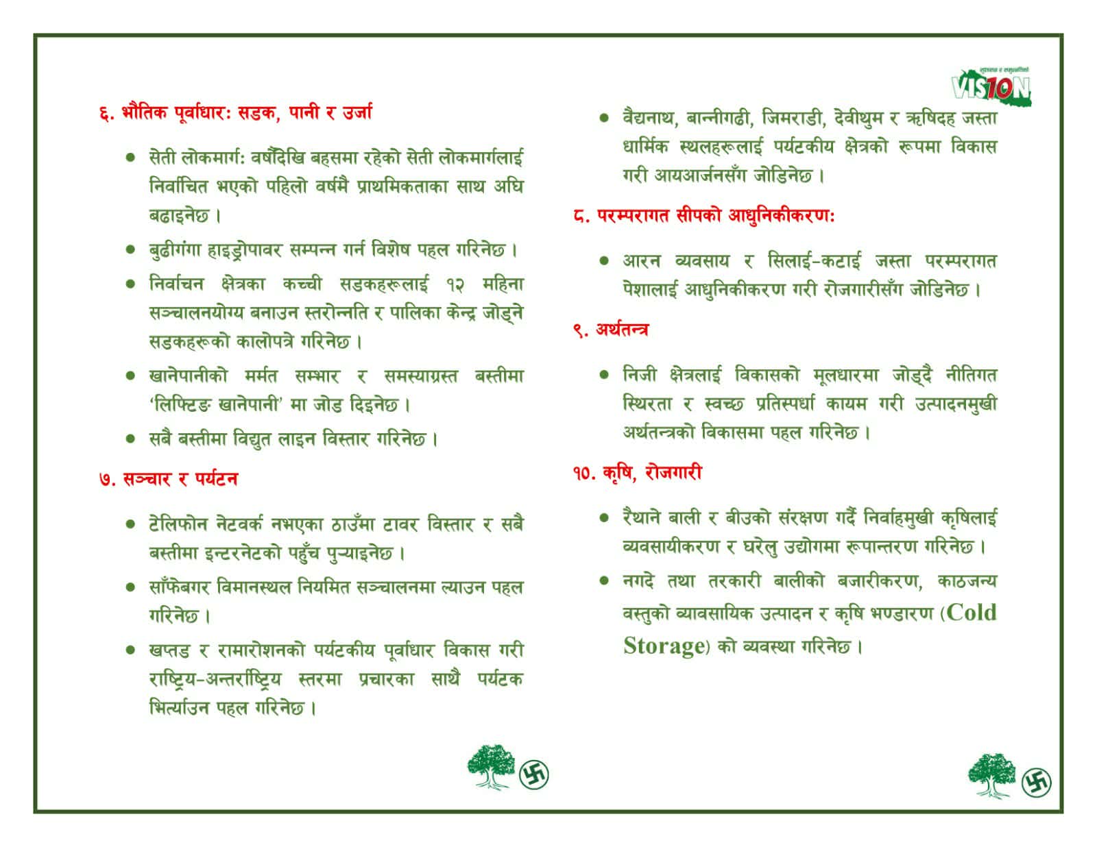 यस्तै संचार र पर्यटन, परम्परागत शिपको आधुनिकीकरण, अर्थतन्त्र, कृषि रोजगारी, युवा तथा खेलकुद र विशेष विकास योजनाहरु पनि प्रतिज्ञा पत्रमा समावेश छन्।