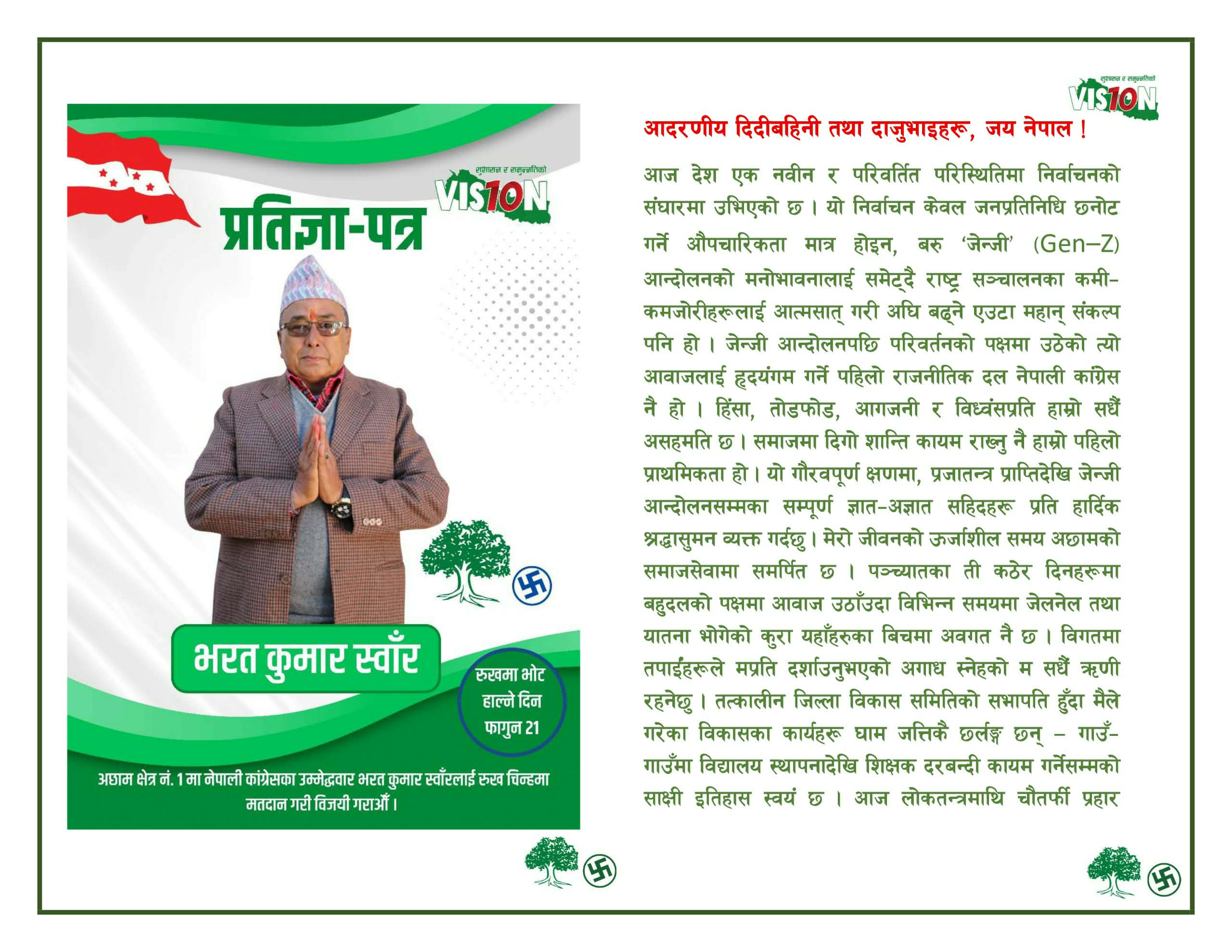 अछाम:नेपाली कांग्रेस अछाम क्षेत्र नम्वर १ का प्रतिनिधि सभा सदस्यका उम्मेदवार भरत कुमार स्वाँरले चुनावी प्रतिज्ञा पत्र सार्वजनिक गरेका छन्।